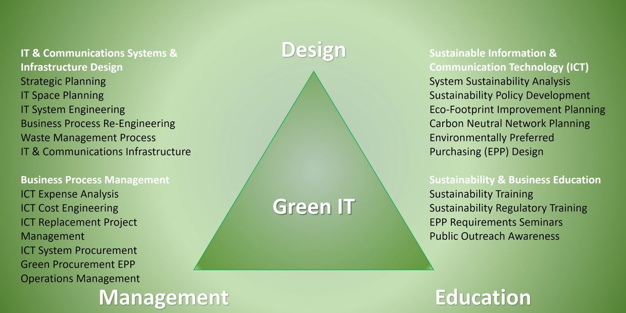 Green IT encompasses various strategies and initiatives to foster sustainability within the technology sector. It involves adopting sustainable practices throughout the lifecycle of IT products and services through various ways: